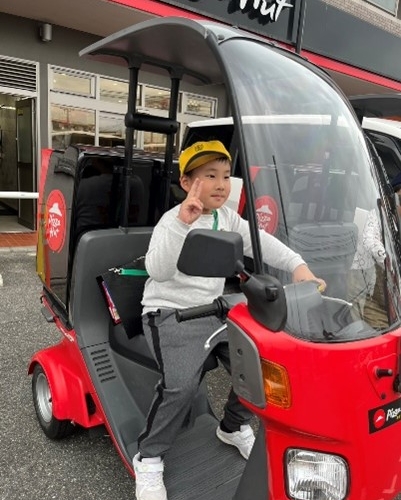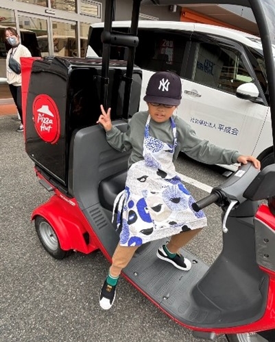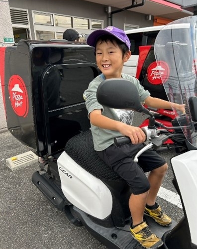 ピザづくりが終わると今度はピザハットのバイクに乗って記念写真!