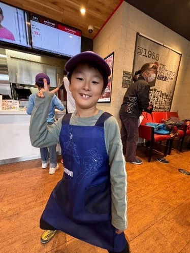 お店につくと、最初に着替えです。持参した帽子をかぶってエプロンを付けて準備完了です。
