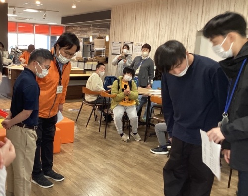 宮領デイセンター、宮領ワークセンター、あおぞらぱん屋さんの3つの事業所を見学されました。まずは宮領デイセンター。写真を見つめながら、職員の話を真剣に聞かれています。次に宮領ワークセンターへ移動します。「工賃がもらえる」ことにとても興味深い様子で、作業を見学されていました。あおぞらぱん屋さんでは、「ここのパン食べたことある!」と笑顔で伝えてくれました。