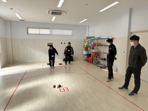 その後は、今回のメインイベントであるパラスポーツの「ボッチャ」を体験しました。個人戦のトーナメント制で、学生さん3名、職員3名の計6名で真剣勝負で戦ったのですが、なんと!!今回の勝負、1位から3位まで学生さんの独占勝ち!強かったです。