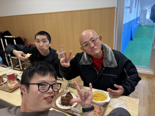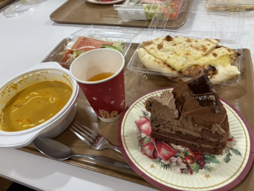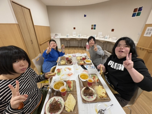 12/26(金)は、宮領ワークセンターにて2025年お疲れ様&クリスマス会を行いました。午前のお仕事を頑張った後、お昼に、チキンカレーとナンのセットとクリスマスケーキ、ジュースを堪能されました。皆さんからは「ナンにチーズが入ってて美味しい!」、「美味しいもの食べ過ぎた~」と、嬉しそうな表情をたくさん見ることが出来ました。