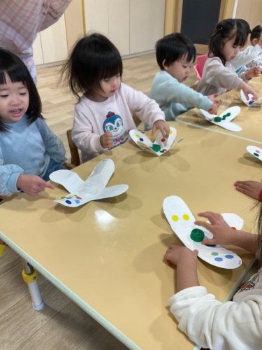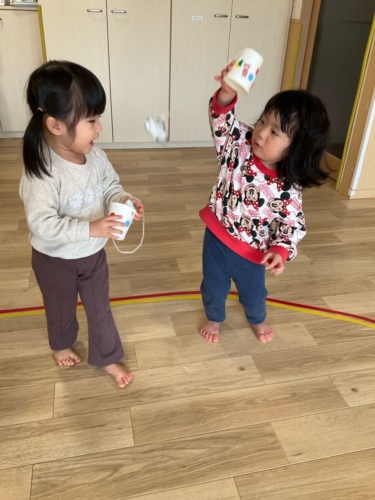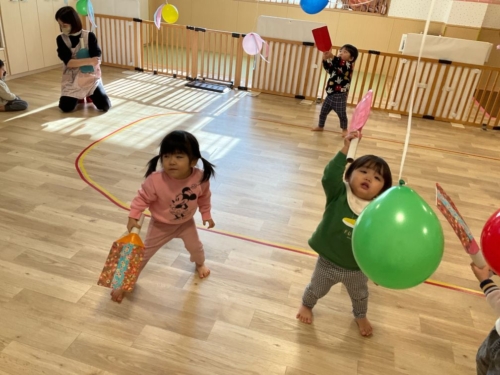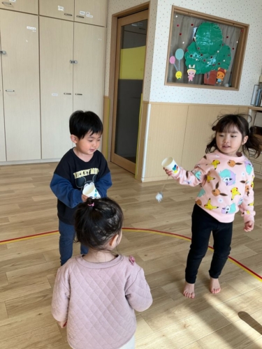 新しい年を迎え、身近な物を利用し子どもたちとお正月遊びを行いました。