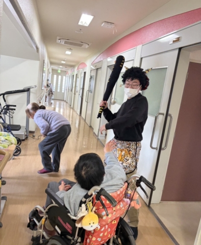 節分といえばもちろん豆まき!職員が鬼に扮し、利用者の方々とご対面。今年一年、福が来ることを願って、思い切り豆を投げました!